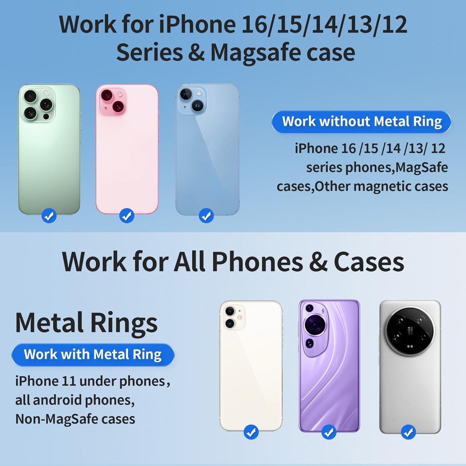 Wide Adaptability Compatible for MagSafe: TSLDRV for MagSafe phone holder for Tesla could place directly to iPhone 16, 16 pro,16 pro max, iPhone 15,15 Pro,15 Pro Max,15 Plus,14,14 Pro,14 Pro Max,14 Plus, iPhone 13,13 Pro,13 Pro Max, 13 Mini, iPhone 12,12 Pro,12 Pro Max,12 Mini & for MagSafe cases. PRO TIPS: The package included two metal rings (won’t interfere with wireless charging) is necessary if it work with other phone models or non-MagSafe cases.